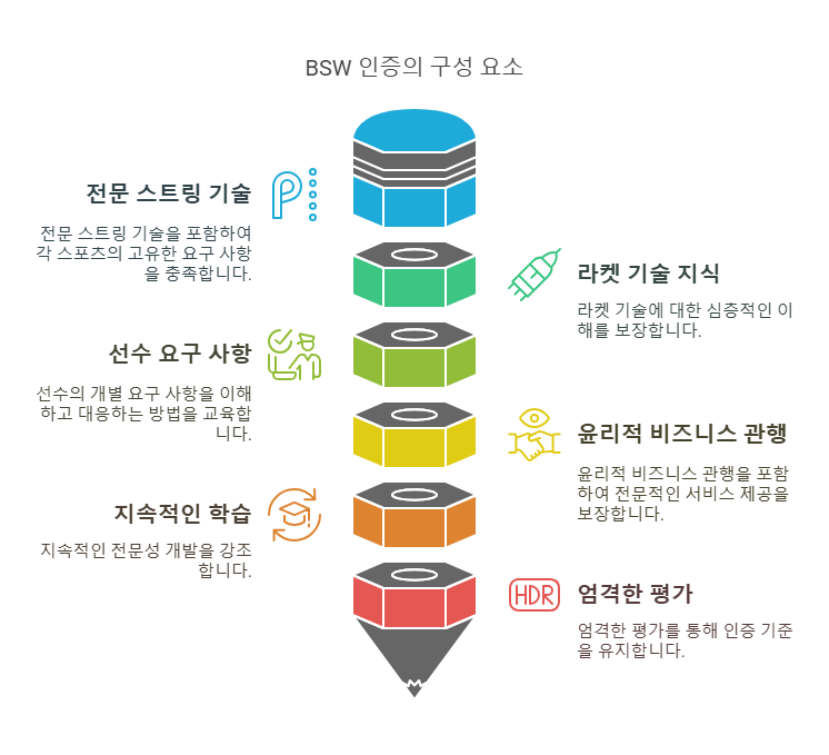 BSW는 엄격한 평가와 정기적인 재인증 과정을 통해 인증된 스트링거들이 업계 최고 수준의 기준을 유지하도록 보장하며, 이는 선수들과 라켓 스포츠 커뮤니티 전체에 혜택을 제공합니다.